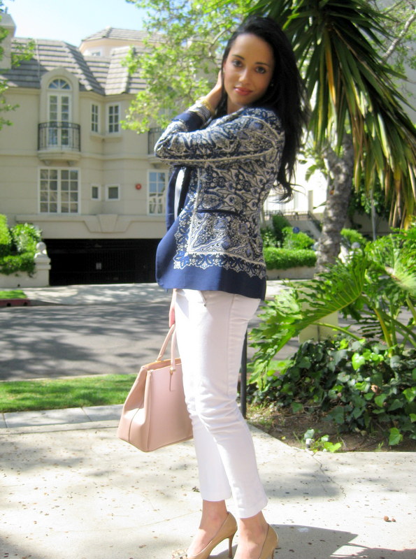 This scarf print blazer can make any outfit a star, but when paired with this silky striped top they are a match made in heaven. I am so in love with Zara’s spring collection (if that isn’t already obvious). I decided to pair the blouse and blazer with white denim, just so that things wouldn’t get too busy. Of course I added some of my favorite gold accessories, and my blush colored bag (which I find to be endlessly versatile), before heading out the door.