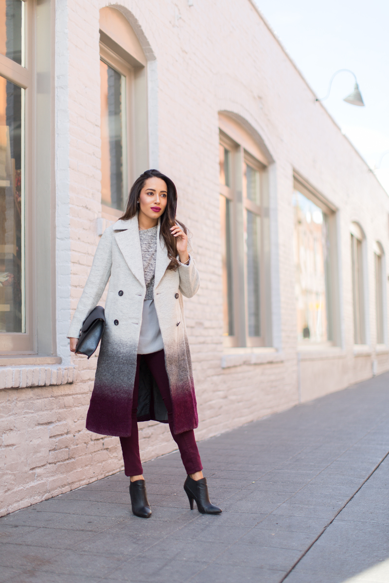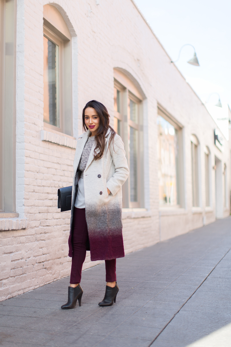 This ombre coat definitely makes me happier about winter. If all of my coat were this cool I would be fine with cold weather all the time. Okay, maybe not, but still it’s pretty amazing. I decided to play off the colors in the coat by pairing it with burgundy skinny jeans, a grey sweater/top, and a silver clutch. This looks was so comfy and chic – I love when that happens!