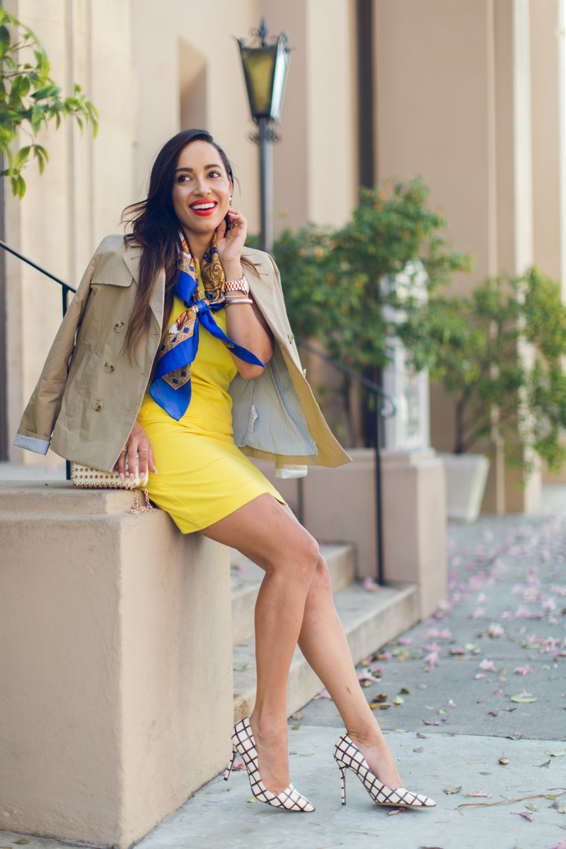 You know how much I love color, so for today’s post I styled my look around this gorgeous vintage scarf. My yellow shift dress paired perfectly with the bold royal blue and the all over chainlink print. I added in printed pumps and a studded clutch for a little extra visual interest.