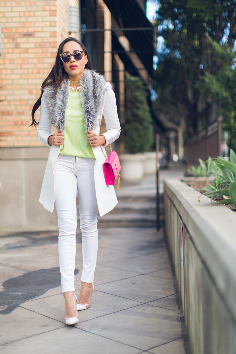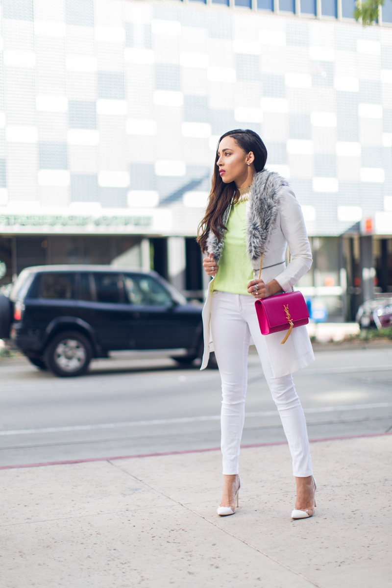 Happy Sunday! As you can tell, I’ve been so into whites for winter lately so I just wanted to share this quick post featuring a crisp white jacket, skinny jeans and my new favorite pumps (yes, again!). I added in a touch of faux fur for texture and a hot pink bag for a pop of color. I couldn’t wait until spring to break out my favorite color palette. I guess some rules are meant to be broken.